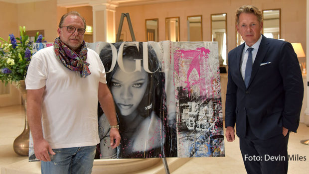 Der Hamburger Künstler Devin Miles stellt derzeit im Grand Hotel Heiligendamm seine aktuellen Arbeiten vor. Gemeinsam mit Thies Bruhn, dem General Manager des Hauses, eröffnete er die Schau in Deutschlands ältestem Seebad.
