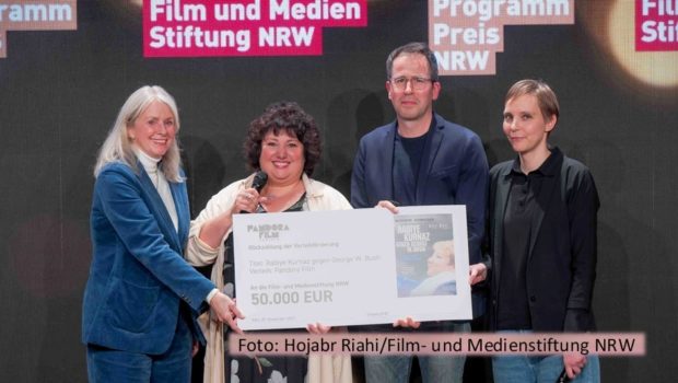 Der Kinoerfolg von „Rabiye Kurnaz gegen George W. Bush“ hat sich auch für die Film- und Medienstiftung NRW ausgezahlt. Hauptdarstellerin Meltem Kaptan und Vertreter von Pandora Film übergaben im Rahmen des Kinoprogrammpreises NRW den Scheck mit der Rückzahlung der Verleihförderung.