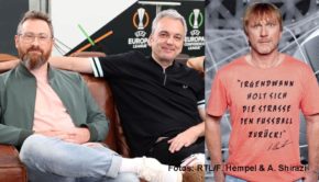 Mindestens eine Hand am Pokal haben Eintracht Frankfurt und die „Viererkette“ bei RTL+. Die Moderatoren Robby Hunke, Anna Kraft und