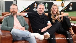 Beim heutigen Fußball-Europokalabend bilden Anna Kraft, Robby Hunke und Arnd Zeigler zusammen mit Weltmeister Lukas Podolski wieder die Moderations-„Viererkette“ beim